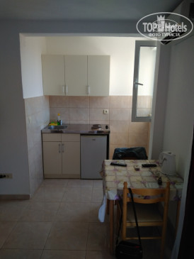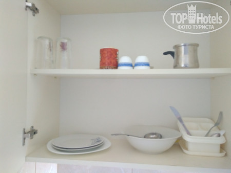 При бронировании тура мы специально подыскивали апартаменты с кухней. Кухня находятся естественно прямо в номере. Состоит она из двух шкафов верхнего и нижнего, холодильника, плиты с двумя конфорками и мойки.
