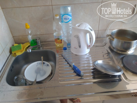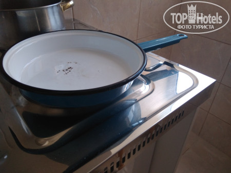 Холодильник работает нормально, за исключением морозилки, про неё можно забыть, она не морозит совершенно, только вода скапливается. В шкафу было найдено подсолнечное масло. А на мойке средство для мытья посуды, новая губка и новая тряпка для стола. Плита жарит очень хорошо и быстро. Другое дело, что сковорода, которая входит в комплект, это одно название (смотри фото). После нашей попытки пожарить на ней курицу, нам повесили объявление про то что в номере нельзя жарить рыбу, мясу и т.п. Из посуды так же имеется две кастрюли, 1 нож (тупой), 2 ножа столовских, 2 вилки, 2 ложки, 2 чайные ложки, 2 кружки, 3 стакана, 2 тарелки глубокие, 2 маленькие, 2 широкие ,а также чайник электрический. Питались мы только здесь, в рестораны не ходили, так что это всё очень пригодилось)