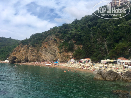 Ближайший пляж Словенский, он многолюдный, лежаки дорогие. Брали свои полотенца. Вода довольно теплая, прогрелась до +26. Были также на хваленом Могрене - за старым городом, нужно пройти мимо стены, затем вдоль скалы (примерно 3 км от виллы). Нам не очень понравилось. Народа оказалось не меньше, заход также камушки и пляж песчано-галечный. Единственное - вид красивый на горы и деревья. Рядом со входом на пляж Могрен стоит Будванская танцовщица, можно сделать фото, проход к камню со статуей открыт.